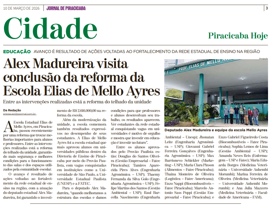 “Quando melhoramos a estrutura das escolas e damos condições para que professores e alunos desenvolvam seu trabalho, os resultados aparecem. Ver estudantes da rede estadual conquistando vagas em universidades é motivo de orgulho e mostra que investir em educação é investir no futuro.” (Jornal de Piracicaba – 10/03/2026).